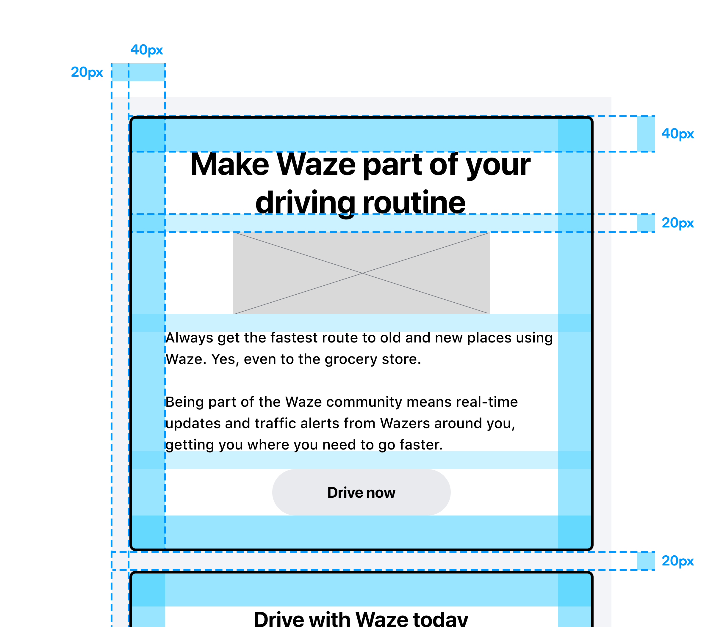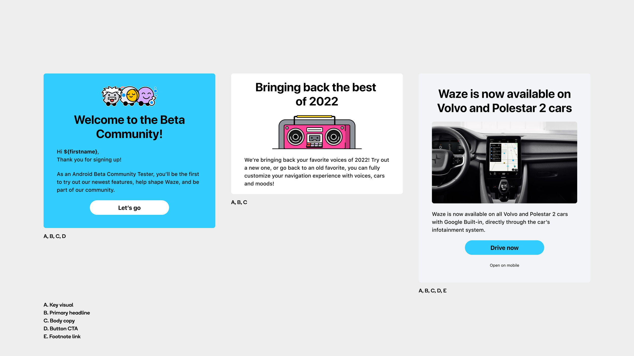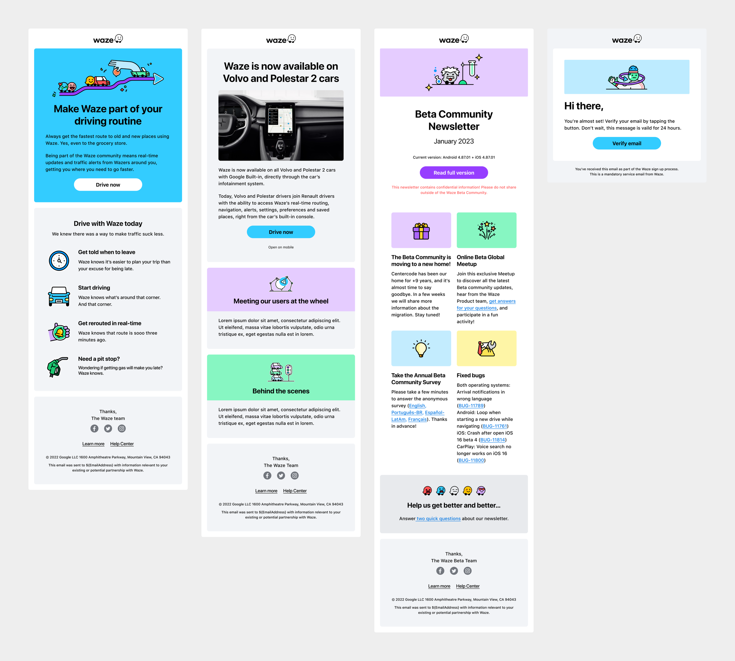 Design direction for evolving Waze’s email design system, ensuring alignment with Google’s ADA accessibility standards, finding more opportunities to imbue the Waze brand, keeping within the limitations of our internal tools, and building a modular system that teams can quickly put together multiple comms with.