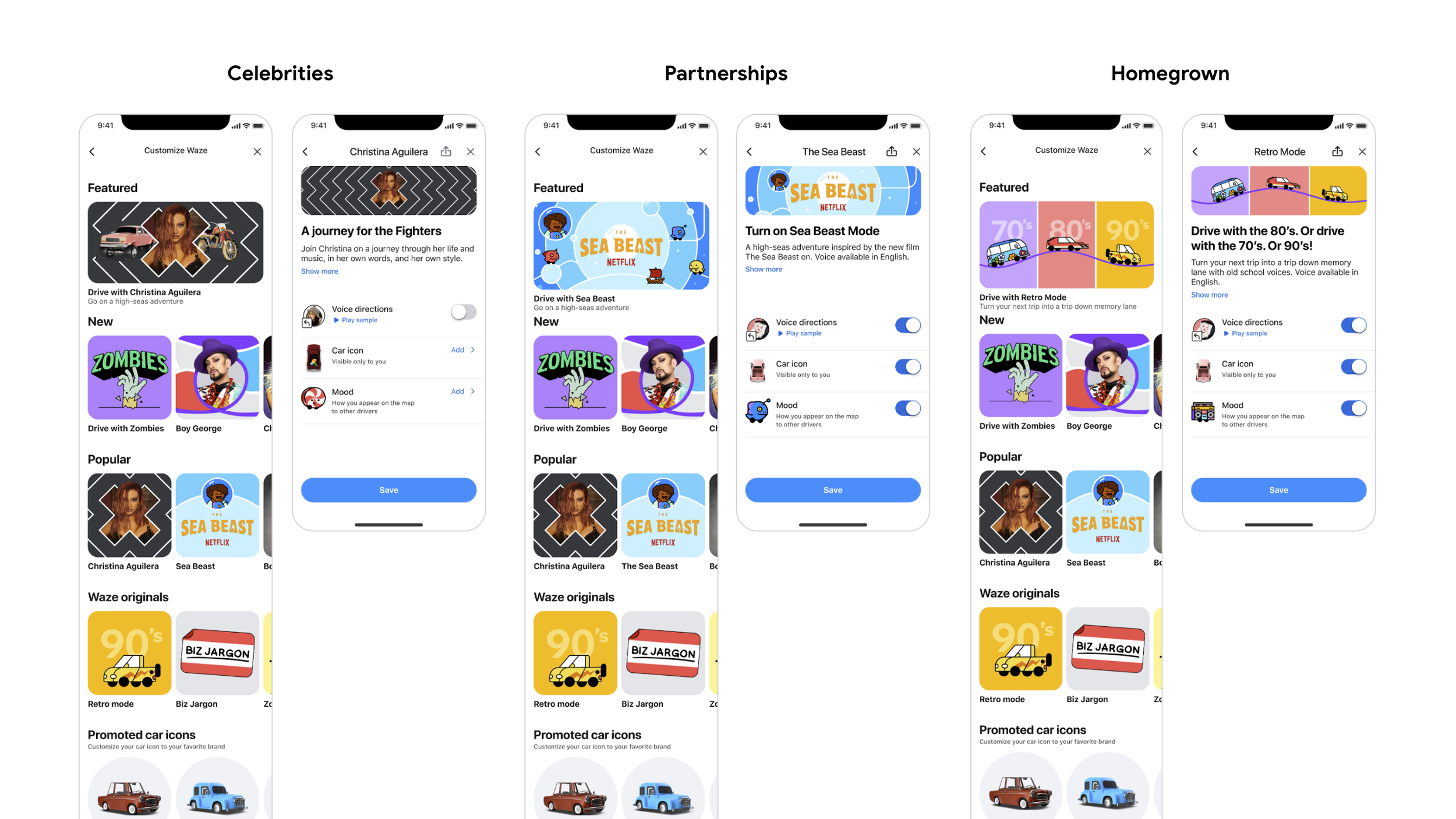 Announcement for our launch of Customize Your Drive (now Pick a Sidekick), a marketplace to add character to your drive, ranging from celebrities, pop culture characters, and our own branded creations. Waze Blog